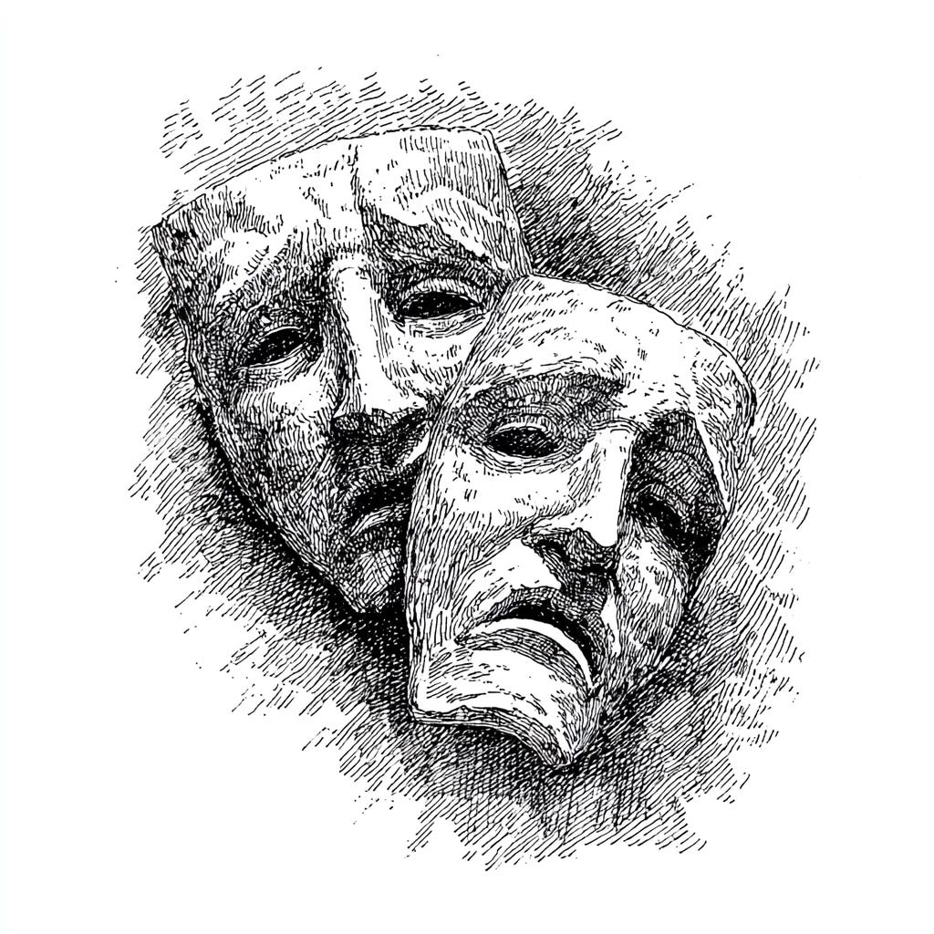 Short days, the Winter Solstice as the world turns, accompanied by celebrations, pagan and faith-based, and the stories that accompany them. And of course, here in the UK, the tradition of pantomime, originating in ancient Greece and Rome as a form of expressive mimicry, which then resurfaced through Italian commedia dell’arte before evolving into the British Christmas tradition we know today. It has become a communal ritual that blends satire, archetypes, and audience participation, which is why we now use “pantomime” as shorthand for any public drama that feels more performative than serious.