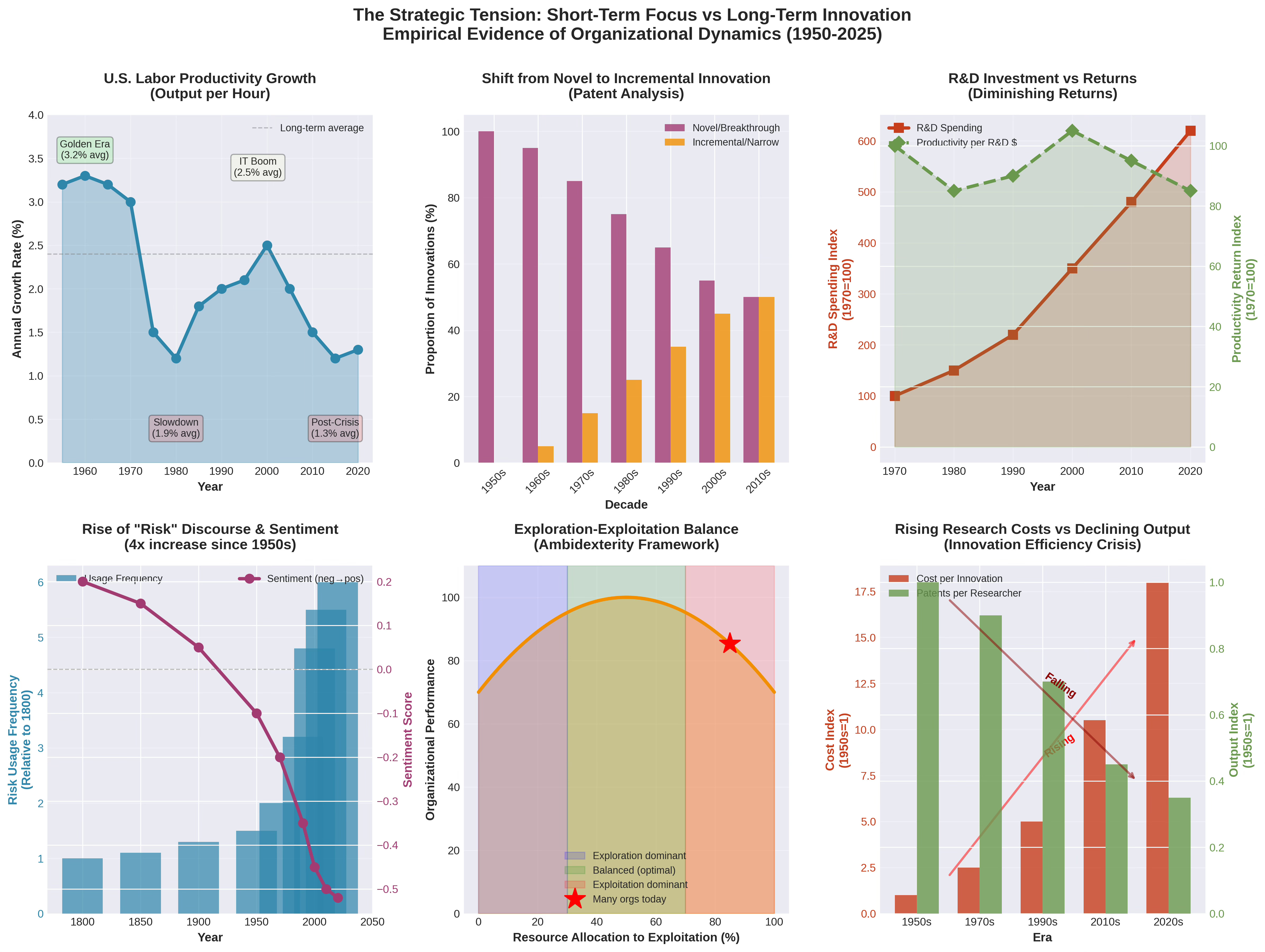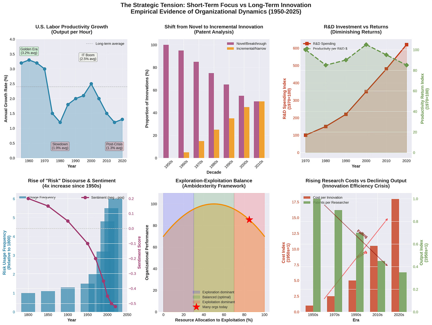 Since the 1950s, R&D spending has increased sixfold, yet productivity returns per research pound have fallen to 85 per cent of 1970 levels. Innovation has shifted from breakthrough to incremental, with most organisations now devoting 85 per cent of resources to optimising existing operations rather than the 50 to 70 per cent balance that yields optimal performance. Rising costs and risk aversion have driven firms and academics alike towards safer, predictable outcomes, even as this strategy produces diminishing returns. The result is a competency trap, organisations running faster to stand still, caught between short-term financial pressure and long-term creative decay.